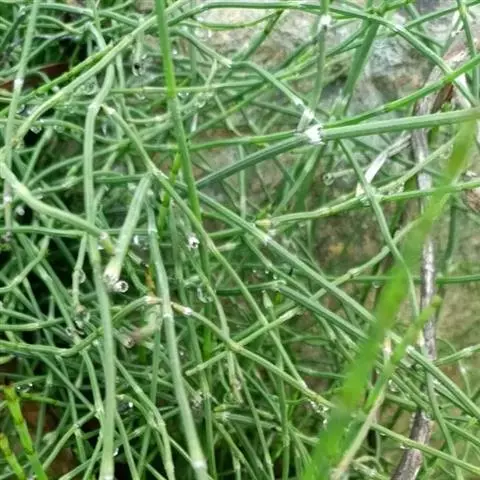 全草长约30厘米,多干缩,或枝节脱落,茎略扁圆形或圆形,浅绿色, 有细纵沟,节间长,每节有退化的鳞片叶,鞘状,先端齿裂,硬膜质。小枝轮生,鞘部渐细,基部有时带有部分的根,呈黑褐色。气微,味稍苦涩。