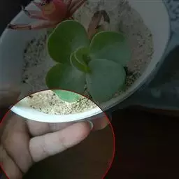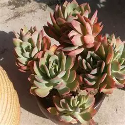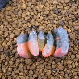 叶子表面宽厚,富肉质感且带有磨纱质感,看像石头质地;开红色小花,生于植株顶部,倒伞形密生,形状像花…