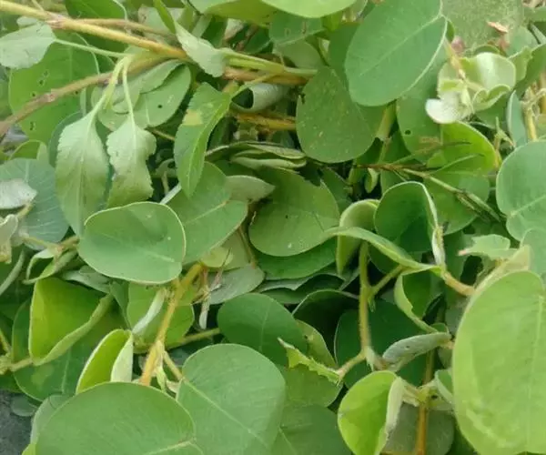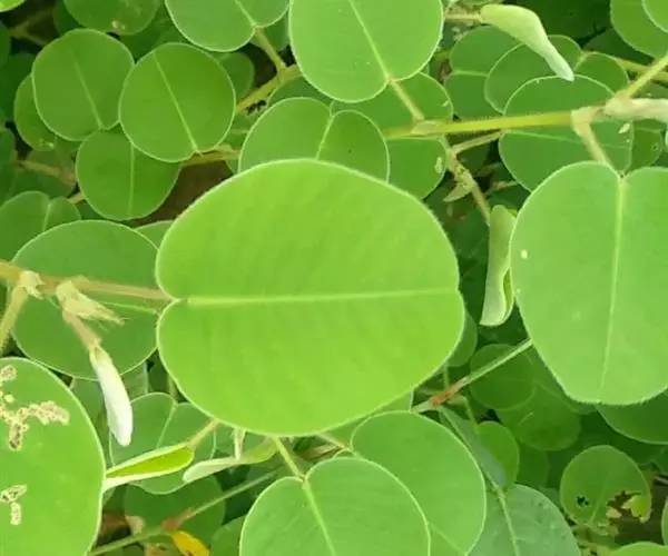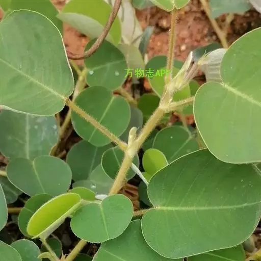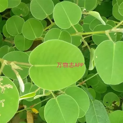 叶通常具单小叶,有时具3小叶;叶柄长1-2厘米,密被贴伏或开展的丝状毛;托叶披针形,长7-8毫米,宽1.5-2毫米,先端尖,基部偏斜,被毛;小叶厚纸质至近革质,圆形或近圆形至宽倒卵形,长与宽均2-4.5厘米,侧生小叶如存在,则较顶生小叶小,先端圆或微凹,基部圆或心形,上面无毛,下面密被贴伏、白色丝状毛,全缘,侧脉每边8-10条;小托叶钻形或狭三角形,长2.5-5毫米,疏生柔毛;小叶柄长5-8毫米,密被贴伏或开展的丝状毛。