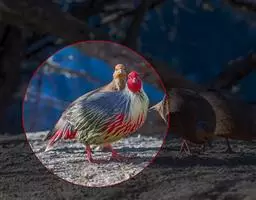 红原鸡是结群活动的乌类,除繁殖季节外,多是7、8只,十几只结群活动,偶尔也能见到20或20多只的大群。它们夜间栖息在树上,清晨下树活动,在林内或林缘觅食。食性很杂,榕树果,竹籽、幼嫩的竹笋、各种花朵、植物的嫩叶和嫩枝、昆虫、蚯蚓等,均是红原鸡的食钧。它们也食常跑到耕地、农田里去觅食各种农作物的种子。在云南南部的许多地方,红原鸡还经常混进村寨旁活动的家鸡群中,也会与家鸡交配,只是孵出来的杂交后代住往野性难改,长大后便飞进森林不再回来。