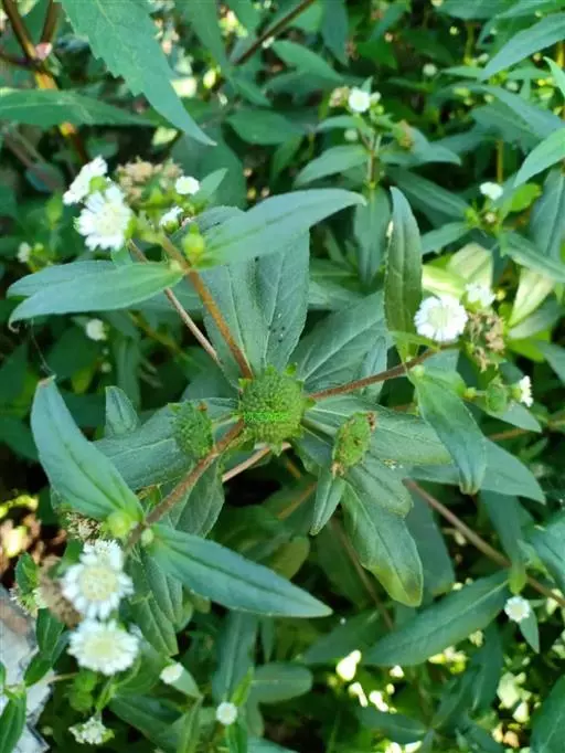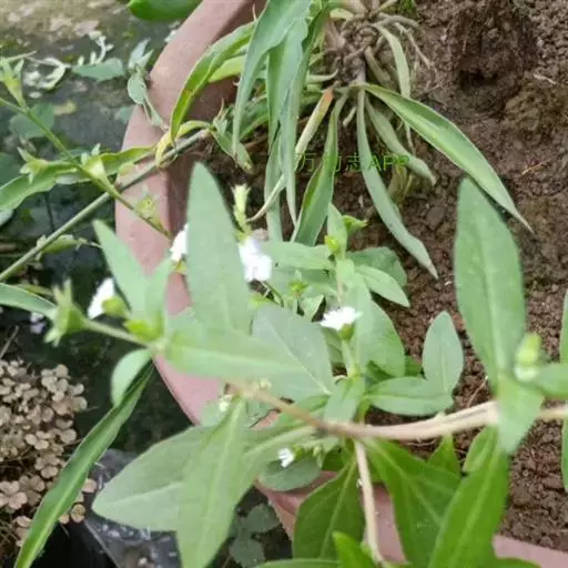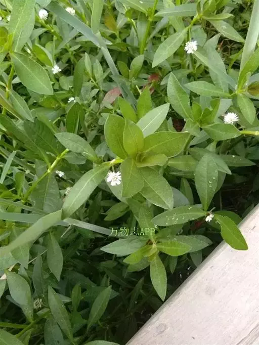 菊科,一年生草本植物。直立,具匍匐茎;叶对生,披针形;头状花序,腋生或顶生,花白色;瘦果黑色。全国广布种。常见于田梗,沟溪边湿地。全草药用,能收敛、止血、补肝肾之功效。即莲子草也,旧不载所出州郡,但云生下湿地,今处处有之,南方尤多。此有二种:一种叶似柳而光泽,茎似马齿苋,高一、二尺许,花细而白,其实若小莲房。 鳢肠