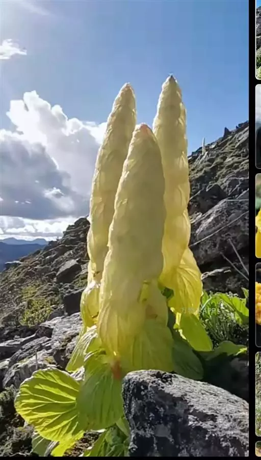 会长出一根高达近两米高的“花柱”;这根“花柱”就像一把太阳伞,撑起一层又一叠的半透明而且乳黄色苞片(其实这是一种变幻姿态的叶子)。此时,塔黄摇身一变,成了高山上最“魁梧”的小草,远远望去,好似一座金碧辉煌的宝塔。这其实是塔黄的“高招”,这些半透明的“瓦片”(苞片)层层叠叠,仿佛一座尖顶的温室,能够积聚热量、提升温度(这就是“温室植物”的由来),经过测量,在晴朗的正午,“室内”温度比寒冷的“户外”甚至高出10℃以上,而且它还能遮风挡雨,这真是太好了!不仅花朵在里面可以热情地自由绽放,昆虫们也有了温暖的“居室”,这些带翅膀的小“居民”们还顺便帮塔黄完成了传播花粉的“大业”。