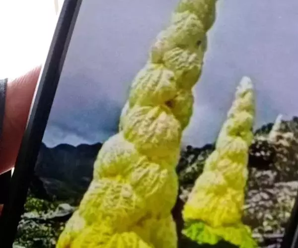 塔黄和竹子一样,是单次结实的多年生草本植物,即经过5-7年的营养生长后才开花结果,之后便死去,一生只开一次花。开花以前的塔黄并不起眼,乍一看去,很像一棵大白菜。但是到了开花这一年,它会长出高达1.5-2米的花序,由下向上逐渐变细;花序外面一层一层包裹着大型半透明的奶黄色苞片,其实这是变态的叶。这时候,它成了喜马拉雅高山地区“身材”最高的草本植物,远远望去,好似一座金碧辉煌的宝塔,格外醒目,“塔黄”一名便由此而来。
