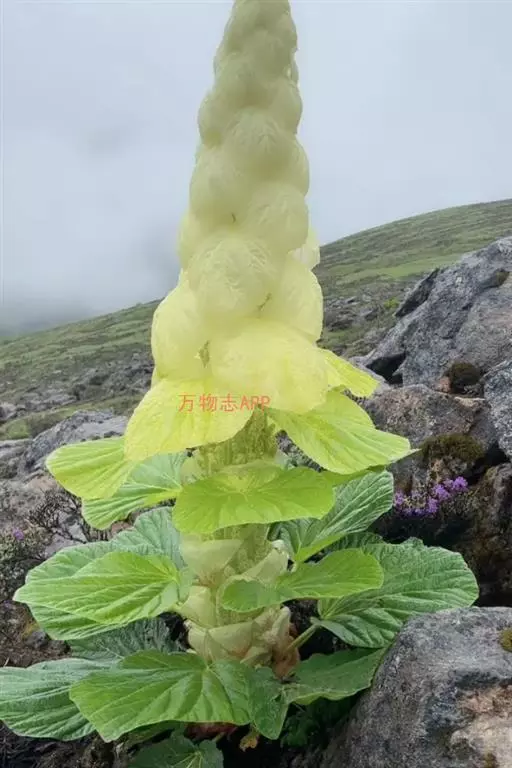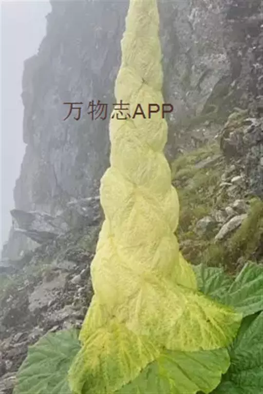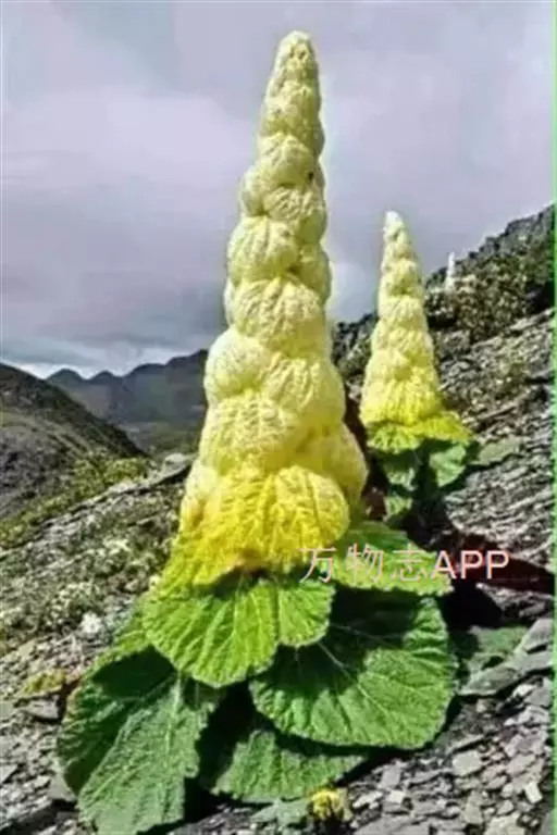 塔黄(学名:Rheum nobile Hook. f. et Thoms.):多年生草本,高1-2米。茎直立,粗壮,不分枝,具多数基生叶及大型苞片。基生叶卵圆形或近圆形,先端圆钝,基部浅心形,革质,上面无毛,下面具小突起;叶柄粗壮,长8-15厘米;托叶鞘膜质,红褐色;苞片卵圆形或圆形,膜质,淡黄色,具网状脉,反折,遮盖花序,花时脱落。花序圆锥状,分枝密集,无毛;花两性,花被片6,成2轮,宿存,椭圆形,淡绿色,花丝细长,外露;花梗中下部具关节;雄蕊9;花盘不发达,子房卵形,具3棱,花柱3,较短,柱头膨大成头状。瘦果连翅成宽卵形。