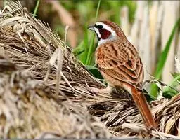 山麻雀:小型鸟类,体长13-15厘米。雄鸟上体栗红色,背中央具黑色纵纹,头棕色或淡灰白色,颏、喉黑色,…
