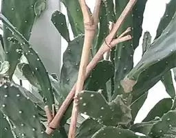 多年生常绿灌木,茎主干似圆柱形,茎部木质化,上 千本剑 部扁平状,多分枝,呈倒卵或长椭圆形,肉质肥厚,着生长刺。新生幼刺软而多汁,呈暗绿色。它的变态茎可因生长位置的不同而具有不同的形态:主干为直立圆柱形,分枝长扁片形,其上又长出圆片形掌片,酷似一株树上的干、枝、叶。其真正的叶分布在各种变态茎上,在幼嫩时呈圆锥形肉质,长0.5cm左右,随掌片长大而老化脱落,又生出针刺状叶。因其株型奇特,又具有仙人掌类喜光耐热耐旱、栽培容易。
