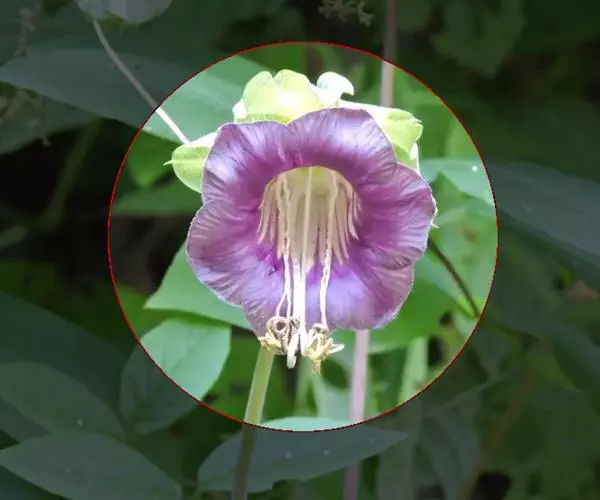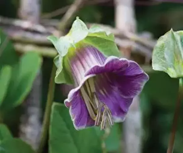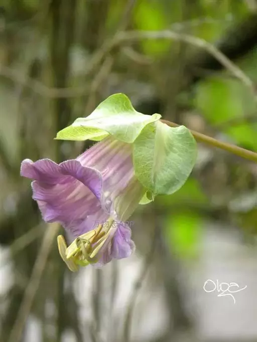 电灯花(Cobaea scandens Cav.)多年生缠绕草本,全株无毛。小叶3对,椭圆形或长圆形,长6-9厘米,宽3.5-4厘米,小叶柄长约1厘米,最下的1对紧靠茎,多少呈耳形或戟形,似托叶状,卷须分枝;花萼裂片宽,近圆形,具小短尖头;花冠长约5厘米,钟状,绿紫色逐渐变紫色。蒴果长约4厘米。种子宽约0.8厘米,薄而平扁。