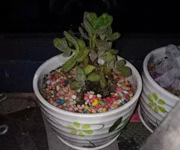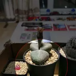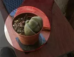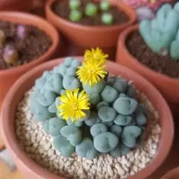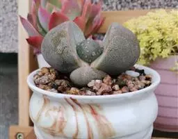 荒玉为番杏科生石花属,原产南非。株体呈白粉色,表面布满凹凸纹路,凹陷处为红褐色,每年秋季开黄花。