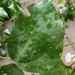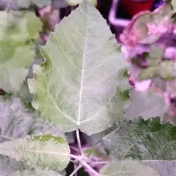 长枝叶扁三角形,通常宽大于长,长约7.5厘米,先端短渐尖,基部截形或阔楔形,边缘钝圆锯齿;短枝叶菱状三角形,或菱状卵圆形,长5-10厘米,宽4-9厘米,先端渐尖,基部阔楔形或近圆形;叶柄上部微扁,长2-4.5厘米,顶端无腺点。叶柄略等于或长于叶片,侧扁,无毛。