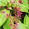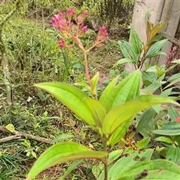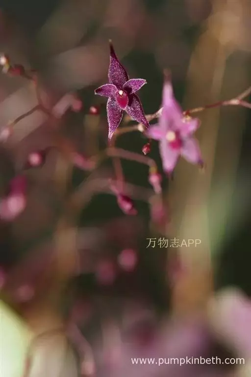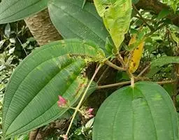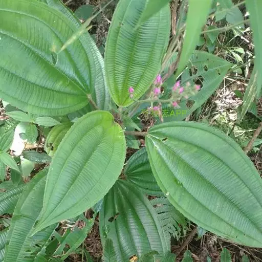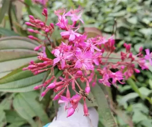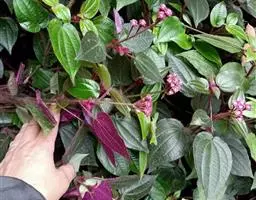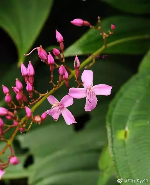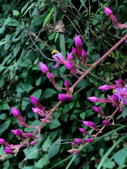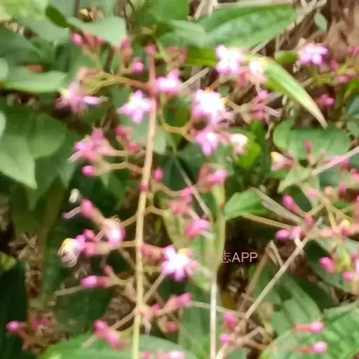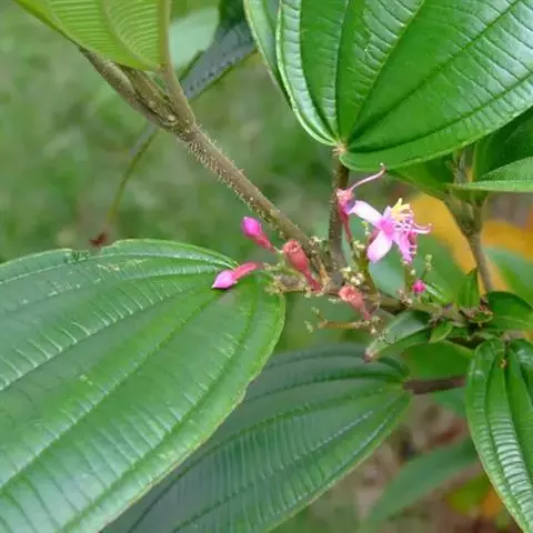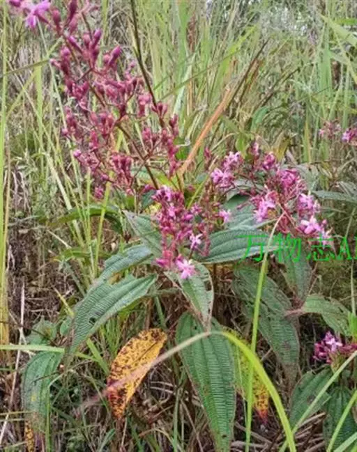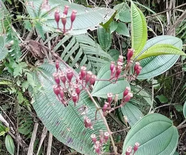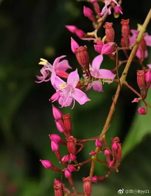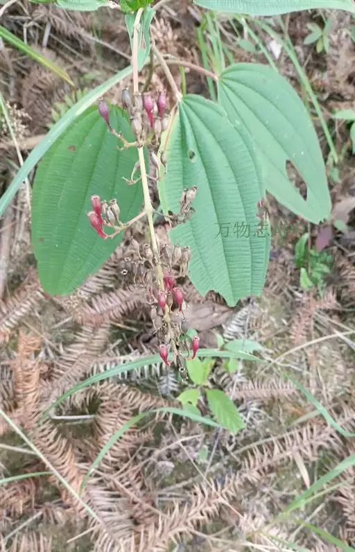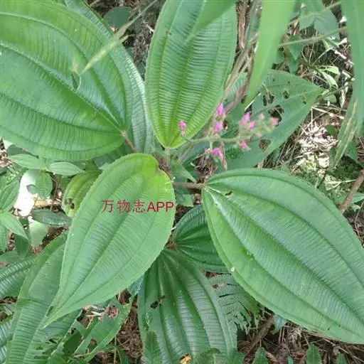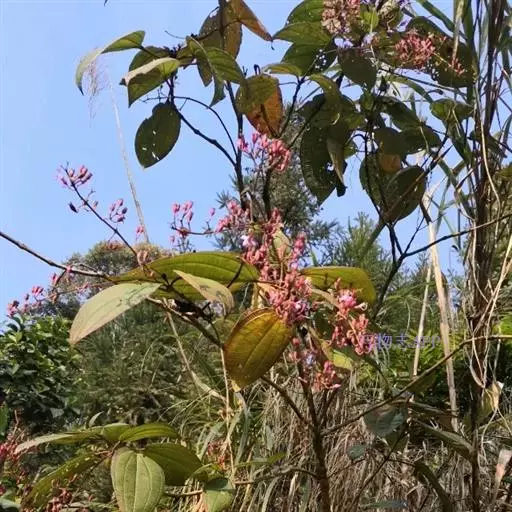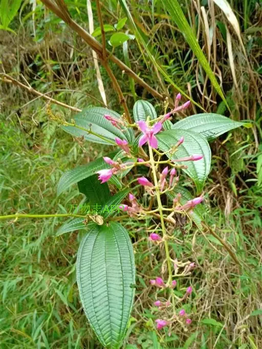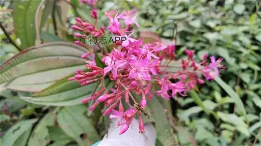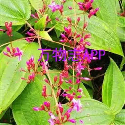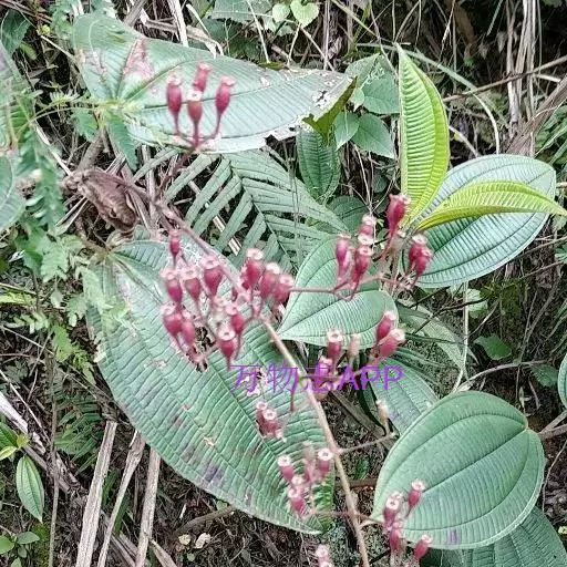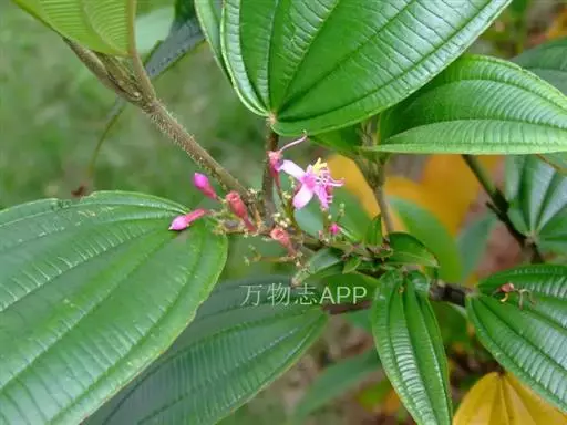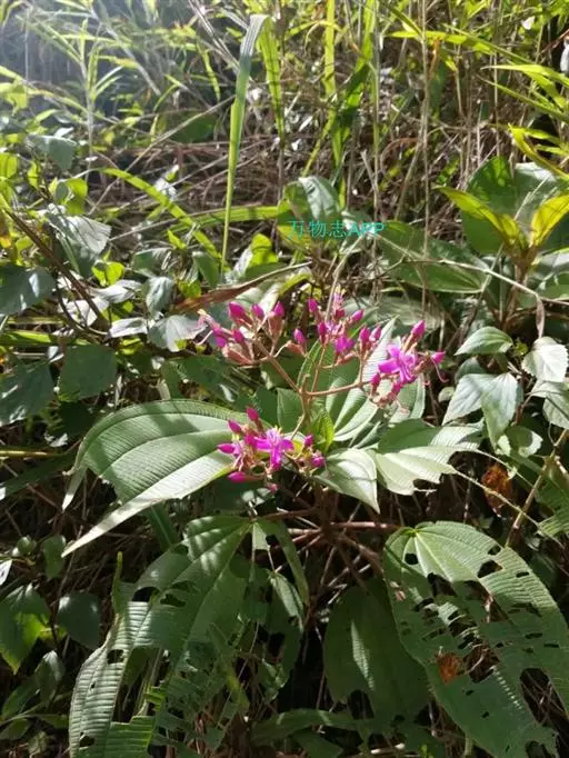 灌木,高1-2米,稀达6米;茎四棱形或钝四棱形,通常具槽,幼时被糠秕状星状毛及具微柔毛的疏刚毛。叶片坚纸质,卵形或狭椭圆状卵形或近椭圆形,顶端渐尖,基部圆形或浅心形,长12-24厘米,宽4.6-11厘米,稀长32厘米,宽15.5厘米,边缘具不整齐小齿,7基出脉,叶面被糠秕状鳞片或几无,基出脉下凹,背面通常仅于脉上被糠秕状星状毛,脉明显,隆起,细脉与侧脉垂直;叶柄长1-7.5厘米,有槽,通常密被糠秕状星状毛,槽内被具微柔毛的刚毛。由聚伞花序组成的圆锥花序,顶生,被糠批状星状毛,长20-30厘米,稀较短,基部具叶状总苞2;苞片和小苞片小,披针形或钻形,长1-3毫米;花萼长约8毫米,幼时密被星状毛,以后渐脱落,狭漏斗形,具钝四棱,有纵脉8条,裂片扁三角状卵形,长约1毫米,顶端急尖,具突起的小尖头;花瓣红色至粉红色,或深玫瑰红色,卵形,长约7毫米,于右上角突出1小片,顶端具突起的小尖头并被微柔毛;雄蕊长者紫色,药隔隆起而不伸长,短者黄色,药隔隆起,基部伸长成短距;子房下位,无毛。蒴果倒卵形,顶端具胎座轴,长约8毫米,直径约6毫米;宿存萼较果长,漏斗形。花期7-9月,稀10月,果期1-3月,稀达5月。