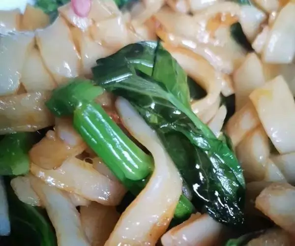 3、等配菜7-8分熟的时候才加入年糕片,加入后很快就可以出锅,否则年糕太软了就不好吃了。
