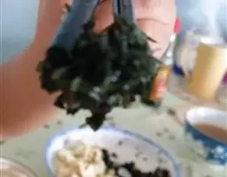 (4)将白饭放入便当中铺平后,上面再将材料(4)排入即成。