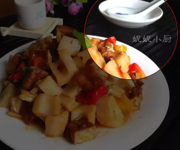 咕咾肉原始也就是最正宗的做法,据一位广东师傅说是在里面放的配料是广东泡菜,做这咕咾肉的时候,就把这个广东泡菜放一碗跟炸过的咕咾肉一起来溜就可以了。