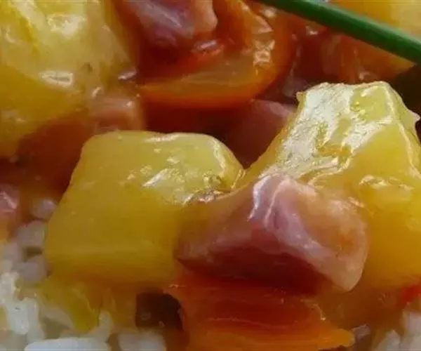 (4)将白饭盛在盘子中,淋上煮好的咕咾肉酱即可。