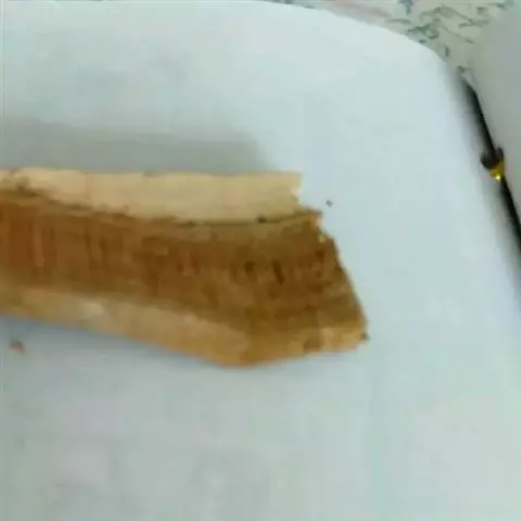 5. 凉后切成长方形,均匀撒上干玉米粉,再用筛子筛去干粉,放入花生油,锅中以中火炸透起锅,撒上白糖即可食之。