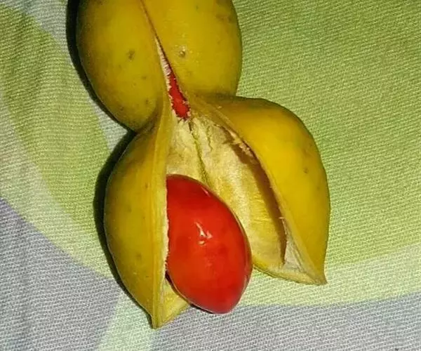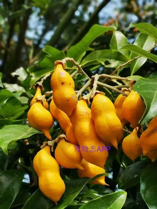 荚果长3-7厘米,宽约2厘米,有种子1-4粒,如具单粒种子时,其基部有明显的果颈,呈镰状,如具数粒种子时,则肿胀而微弯曲,种子间缢缩,果瓣厚木质,成熟时橙红色,干时褐色,有淡色斑点,光滑无毛;种子椭圆形,长15-20毫米,种皮红色,种脐长不足1毫米,位于短轴一端。花期7-8月。