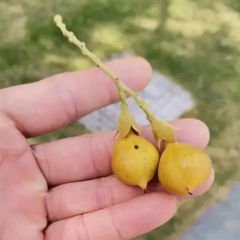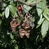 海南红豆结果时间较迟,且有大小年之分。单株产果量15~25kg不等。其果熟期可从11月中旬一直延续到次年1月下旬。采种应于12月上中旬当果实盛熟时采收肥大饱满呈橙黄色荚果,置于太阳下 海南红豆的豆荚 暴晒至自行开裂脱出艳红色种子。出种率12%~13%,种子千粒重968~1168Kg。处理好的种子切忌暴晒,稍阴干即可播种,最好是即采即播,否则会降低发芽势和发芽率。如需贮藏,需剥去或置于水中搓擦洗去红色种皮,伴以细沙或椰渣用薄膜袋密封可贮藏1~2个月。如不及时处理,半个月以内即霉烂甚至失去发芽力。