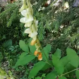 圆锥花序顶生,长20-30厘米;花长1.5-2厘米;花萼钟状,比花梗长,被柔毛,萼齿阔三角形;花冠粉红色而带黄白色,各瓣均具柄,旗瓣长13毫米,瓣片基部有角质耳状体2枚,翼瓣倒卵圆形,龙骨瓣基部耳形;子房密被褐色短柔毛,内有胚珠4粒,花柱无毛而弯曲。
