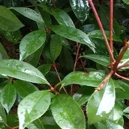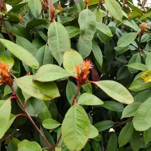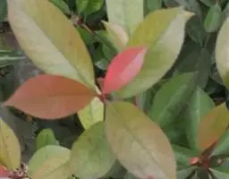 常绿乔木,高3-5米,可达7米;老枝灰黑色,无毛,皮孔棕黑色,近圆形,散生。叶片革质,幼时及老时皆呈红色,椭圆形、长圆形或长圆倒卵形,长5-9厘米,宽2-4厘米,先端渐尖,基部楔形,边缘有疏生浅钝细锯齿,两面无毛,侧脉10-18对;叶柄长1-1.5厘米,无毛。