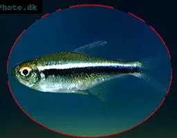 宝莲灯鱼-图鉴 宝莲灯鱼成鱼体长 4~5 厘米体呈纺锤形,体侧扁,头和尾柄较宽,吻圆钝。其口、眼稍大,臀鳍延长,尾鳍叉形。宝莲灯鱼体色艳丽,背部呈黄绿色,腹部乳白色。最显著的特色是在体侧,从眼后缘到尾柄有一条较宽的明亮的蓝色纵带,纵带下方后腹部有一片红色斑块,十分醒目。