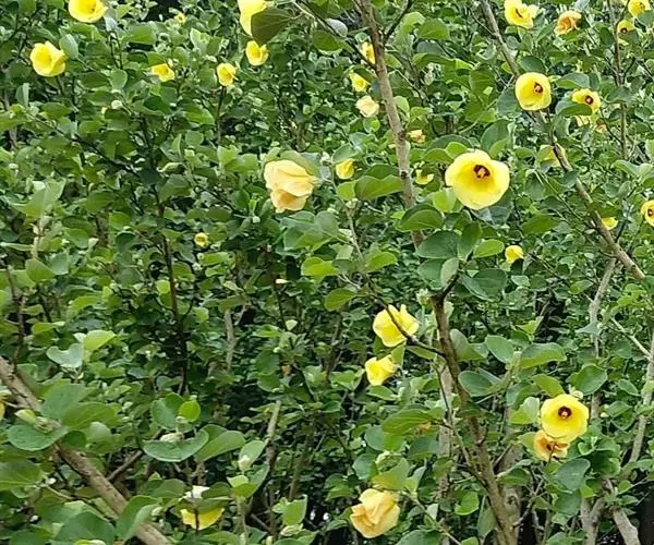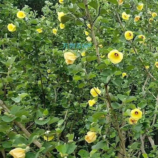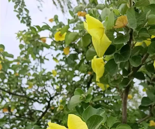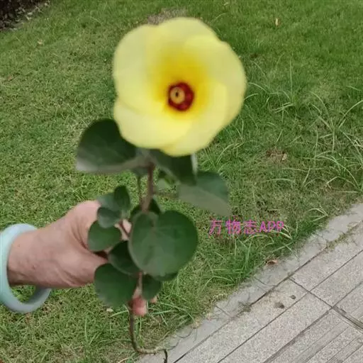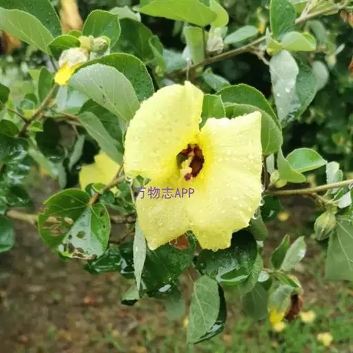 花两性,单生于近枝端叶腋,花梗长0.5-1厘米,小苞片数8-10,花萼长2厘米,花冠直径5.8厘米,金黄色花冠呈钟状、花瓣5、倒卵形、外卷,内侧基部暗紫色。三角状卵形蒴果,长2厘米;褐色种子呈肾形,长0.5厘米,具腺状乳突。
