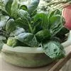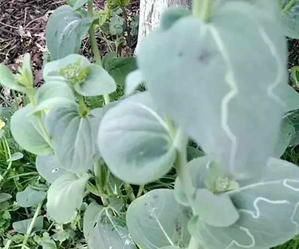 基生叶倒卵形或宽倒卵形,长20-30厘米,坚实,深绿色,有光泽,基部渐狭成宽柄。全缘或有不显明圆齿或波状齿。中脉白色。宽达1.5厘米,有多条纵脉;叶柄长3-5厘米,有或无窄边;下部茎生叶和基生叶相似,基部渐狭成叶柄;上部茎生叶倒卵形或椭圆形,长3-7厘米,宽1-3.5厘米,基部抱茎,宽展,两侧有垂耳,全缘,微带粉霜。
