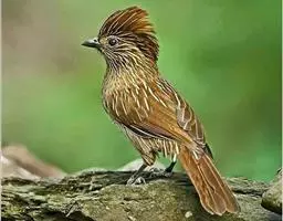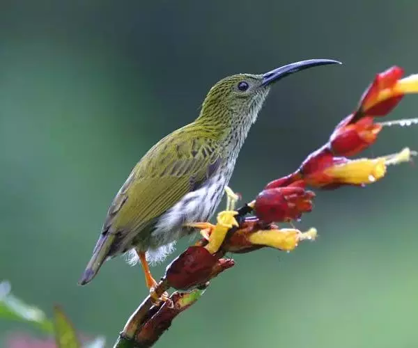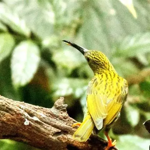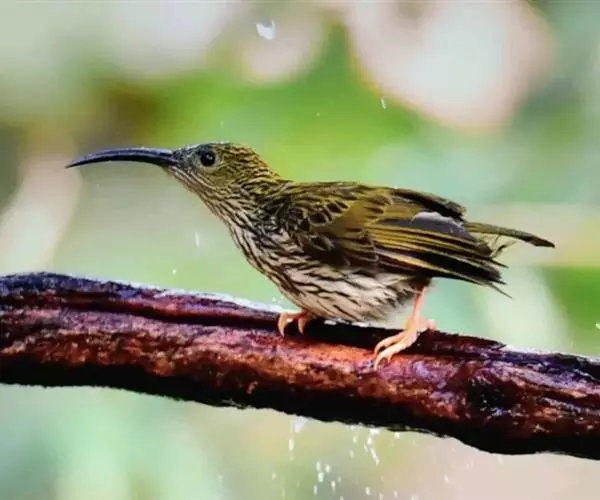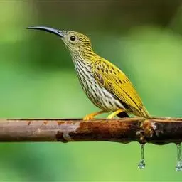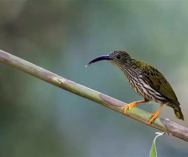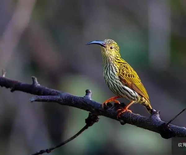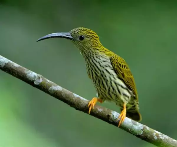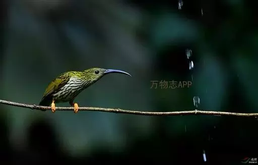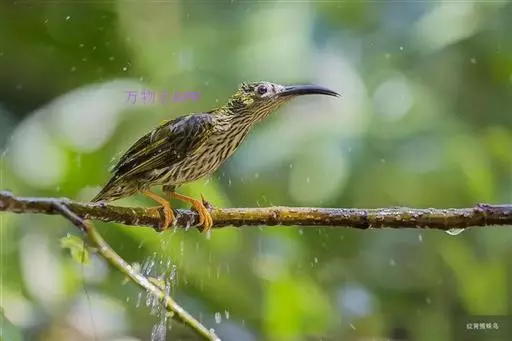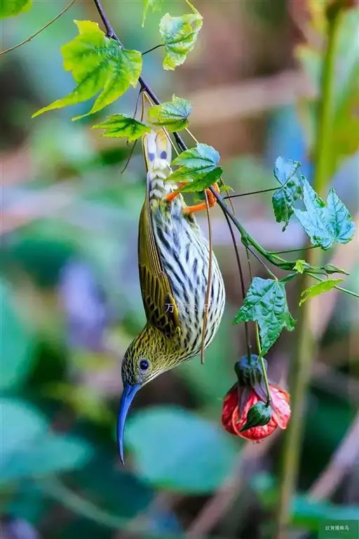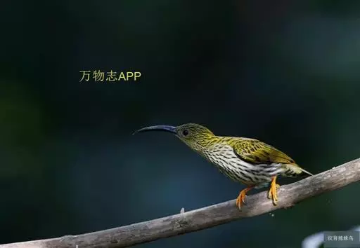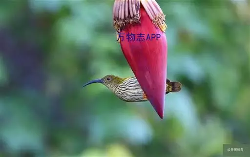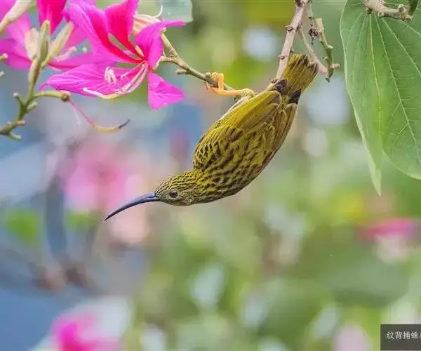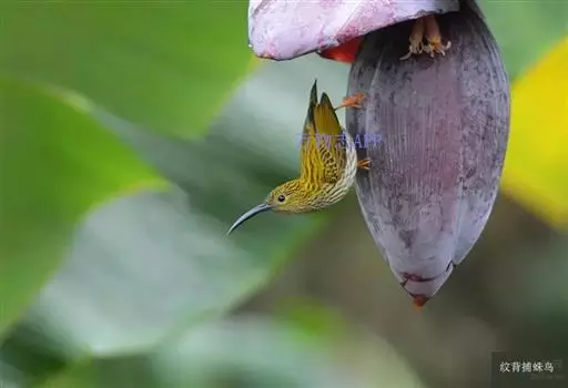 纹背捕蛛鸟(学名:Arachnothera magna):为太阳鸟科捕蛛鸟属的鸟类。是太阳鸟科中体型较大的一种,体重25-45克,体长160-210毫米。嘴粗长而尖且向下弯曲。上体橄榄黄色具黑色中央斑纹。下体淡黄白色满布黑色纵纹,尾具黑色次端斑。虹膜褐色,腿鲜艳橘黄色,嘴黑色。
