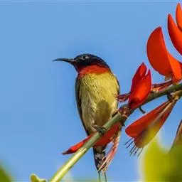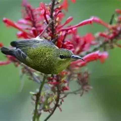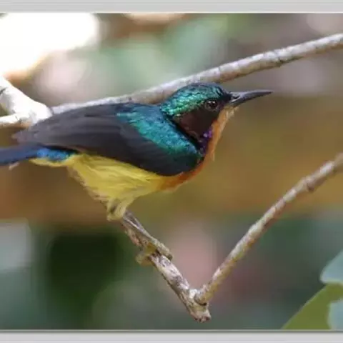 黑胸太阳鸟:小型鸟类,体长9-15厘米。嘴细长而向下曲。雄鸟中央尾羽特长,尾呈楔形,…