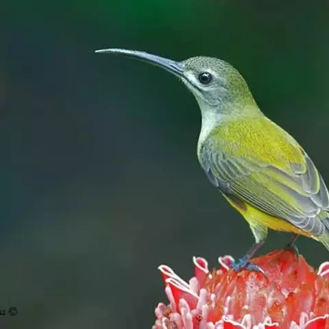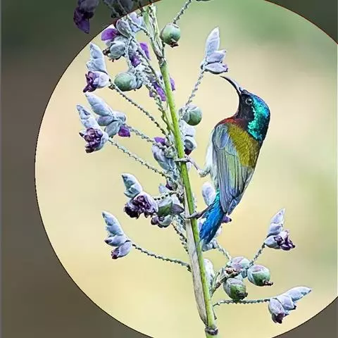叉尾太阳鸟,雀形目太阳鸟科太阳鸟属留鸟;为小型鸟类,雄鸟头顶辉蓝绿色,上体橄榄绿色,腰明黄色,…