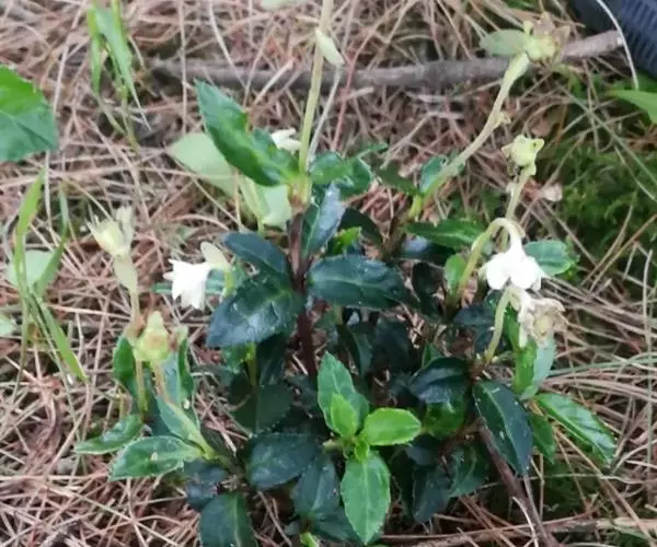 常绿半灌木状草本,高8—18厘米;根状茎细长,横生,地上茎直立, 少有分枝,圆柱形,无毛。叶对生,或互生、近对生,排成轮状;叶片革质,宽披针形,稀椭圆形,长1.5—3厘米,宽0.6—0.8厘米,先端急尖,基部圆形或宽楔形,叶面深绿色,背面稍淡,两面无毛,边缘具疏锯齿,中脉于叶面凹陷,背面凸起,侧脉不显;叶柄长5—8毫米,无毛。总花梗长3—5厘米,直立,具乳头状突起,下部有1—2个膜质苞片。花1—2朵顶生,白色,俯垂,直径1—1.2厘米;萼片5,膜质,宽披针形,长6—7毫米,边缘有不整齐的锯齿;花瓣5,倒卵状圆形至倒卵状长圆形,长7—8毫米,宽3.5—4.5毫米;雄蕊10,花丝短,长约2毫米,中下部扩大如翅状,具缘毛;花药2室,顶孔开裂;花柱极短倒圆锥形,柱头盾状,有5个波状齿。蒴果扁球形,直径4—5毫米。花期6—7月,果期8—10月。