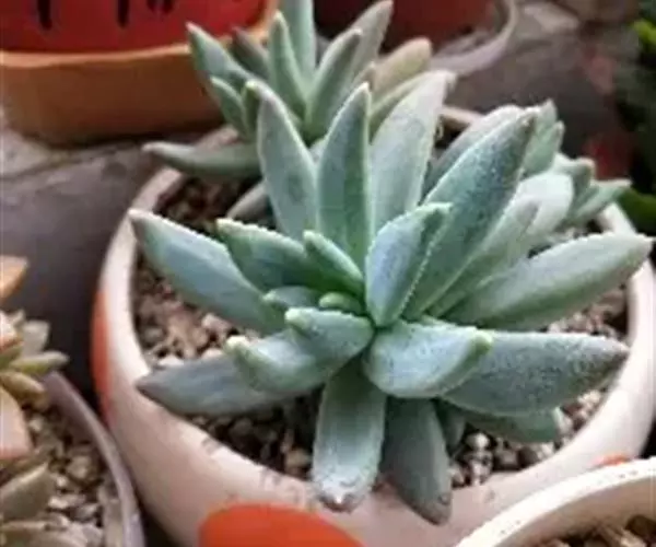 蓝黛莲是一种景天科厚叶草属植物。叶片呈略扁的圆柱形,排列成莲座状;颜色为灰绿色,…