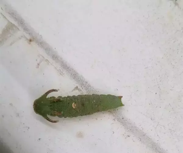 末龄幼虫体色深绿,体长33-62mm,色斑褐色。头深绿色,宽7-8mm;角突 白带螯蛱蝶---幼虫 绿色,长7.3-8.1mm。