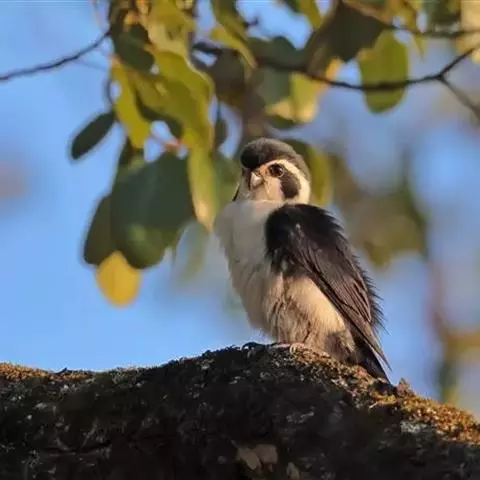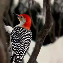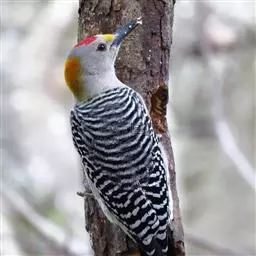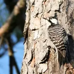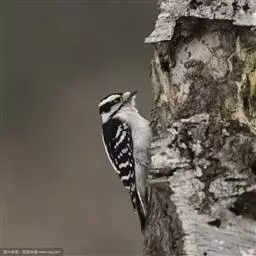 绒啄木鸟,北美洲最小的啄木鸟,白腹黑背和黑项,黑翼上有白色斑点。头部有黑白相间的条纹,尾巴短小,雄…