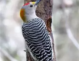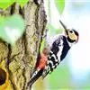 红腹啄木鸟成年雄鸟头项有红帽,翅膀和上体是黑白相间的斑纹状羽毛,腹部有一片红羽毛。头亦大,但颈较长,…