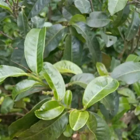 叶革质,椭圆形,长3-5厘米,宽2-3厘米,先端短尖,基部楔形,有时略圆,上面干后深绿色,发亮,下面褐绿色,无毛,侧脉5-6对,在上面不明显,在下面能见,网脉不显著;边缘有细锯齿,叶柄长4-6毫米,稍被残毛。