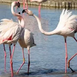 火烈鸟与雁类相似的叫声此起彼伏,震耳欲聋,远远望去,红腿如林,一条条长颈也频频交替蠕动,十分壮观。它们性情温和,平时显得胆怯而机警,游泳的技术也很出色。飞翔时,能把颈部和两腿伸长呈一条直线,而且只要有一只飞上天空,就会有一大群紧紧跟随,边飞边鸣。
