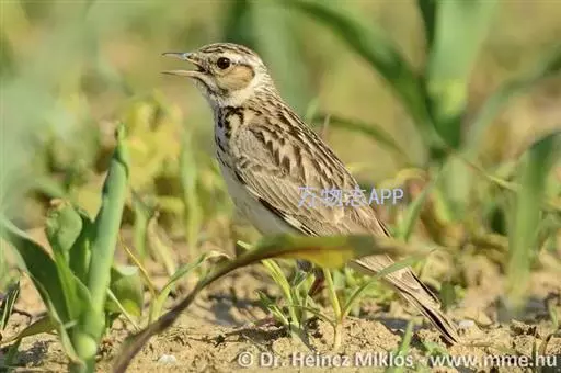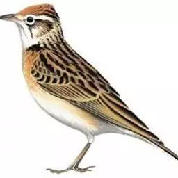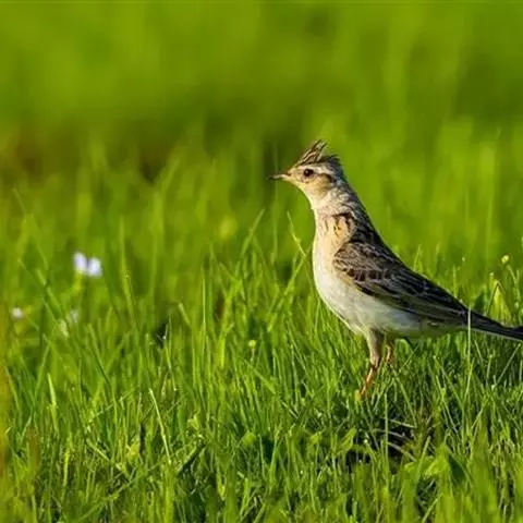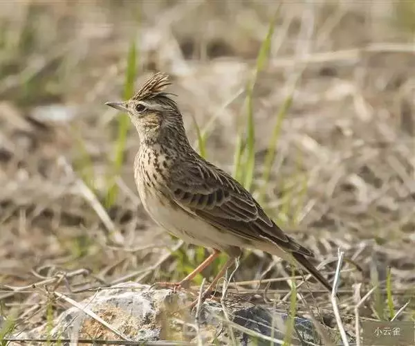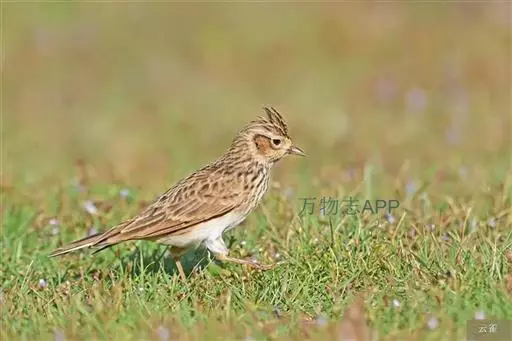 云雀(学名:Alauda arvensis)小型鸣禽,体型及羽色略似麻雀,雄性和雌性的相貌相似。背部花褐色和浅黄色,胸腹部白色至深棕色。外尾羽白色,尾巴棕色。后脑勺具羽冠,适应于地栖生活,腿、脚强健有力,后趾具1长而直的爪;跗跖后缘具盾状鳞;以植物种子、昆虫等为食,常集群活动;繁殖期雄鸟鸣啭洪亮动听,是鸣禽中少数能在飞行中歌唱的鸟类之一。求偶炫耀飞行复杂,能“悬停”于空中;在地面以草茎、根编碗状巢,每窝产卵3-5枚,孵化期10-12天。生活在草原、荒漠、半荒漠等地。云雀是丹麦、法国的国鸟。