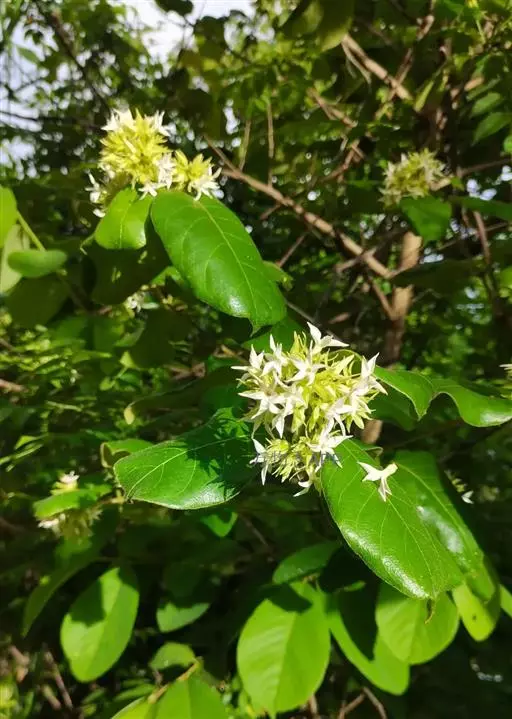伞形花序,生于枝条顶端,无柄,有花10余朵;花梗长约1厘米,多少具腺点;花长约9毫米,花萼仅基部连合,长约5毫米,无毛,萼片斜菱形,不对称,顶端广圆形,薄,基部厚,全缘,紧包花冠;花冠白色,钟形,长约9毫米,管长3-4毫米,里面被长柔毛,裂片卵形,顶端渐尖,基部略不对称,长约5毫米,花时反折,花后全部脱落,子房为花萼紧包,露圆锥形花柱;雄蕊较花冠略短;花丝基部连合成管,与花冠管等长或略短,连合部位向花冠的一面被长柔毛,里面无毛,分离部分无毛;花药卵形或长卵形,与花丝几成丁字形;雌蕊与花冠等长,子房卵形,与花柱无明显的界线,连成一圆锥体。蒴果圆柱形,弯曲如新月形,顶端渐尖,长约6至8厘米,直径约5毫米;宿存萼紧包基部。花期12月至翌年1-2月,果期10-12月,有时花期4月,果期2月。