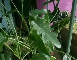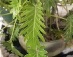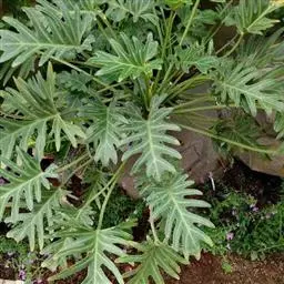 块茎扁球形。叶1枚;叶柄长达1米,有白绿色斑纹;具3小叶,2歧分叉,裂片再羽状分裂,顶生小叶片披针形,下部小裂片椭圆形至披针形。
