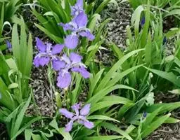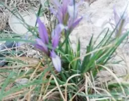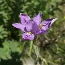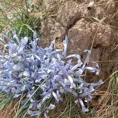 紫苞鸢尾(学名:Iris ruthenica Ker Gawl.):多年生草本,植株基部围有短的鞘状叶。根状茎斜伸,二歧分枝,节明显;须根粗,暗褐色。叶条形,灰绿色,有3-5条纵脉。花茎纤细,略短于叶,高15-20厘米,有2-3枚茎生叶;苞片2枚,膜质,内包含有1 朵花;花蓝紫色,直径5-5.5厘米;外花被裂片倒披针形,有白色及深紫色的斑纹,内花被裂片直立,狭倒披针形。蒴果球形或卵圆形,直径1.2-1.5厘米,6条肋明显,顶端无喙;种子球形或梨形,有乳白色的附属物,遇潮湿易变粘。花期5-6月,果期7-8月。