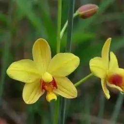 苞舌兰:假鳞茎扁球形,通常粗1-2.5厘米,被革质鳞片状鞘,顶生1-3枚叶。叶带状或狭披针形,…