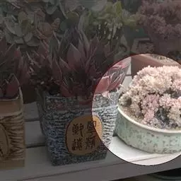 叶子表面宽厚,富肉质感且带有磨纱质感,看像石头质地;开红色小花,生于植株顶部,倒伞形密生,形状像花…