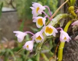 玫瑰石斛是兰科石斛属的多年生附生草本植物。茎斜下或下垂,青绿色,圆柱形,…