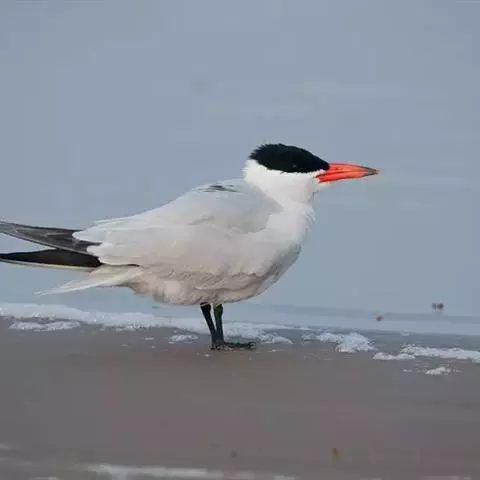 红嘴巨鸥,大型水鸟,体长47~55厘米。夏羽前额、头顶、枕和冠羽黑色。后颈、尾上覆羽和尾白色,…
