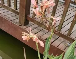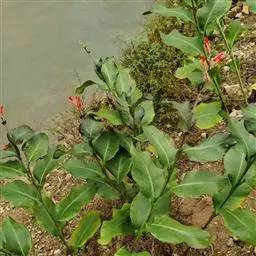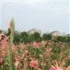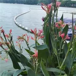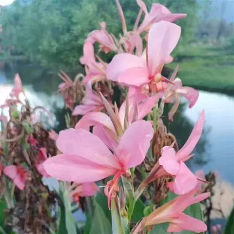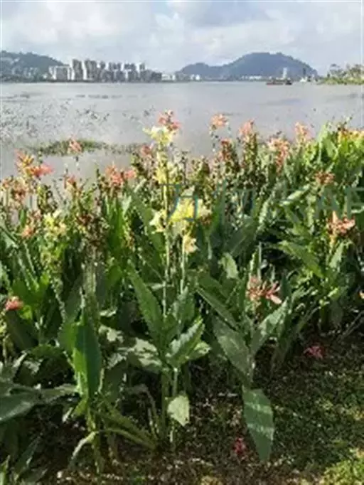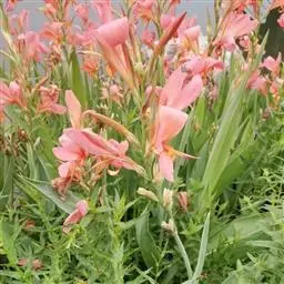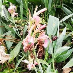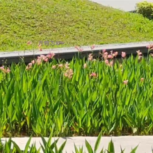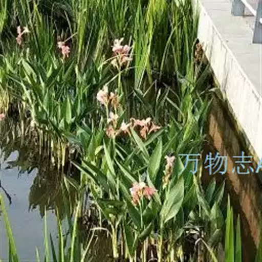 粉美人蕉(学名:Canna glauca L.):是一种球根草本植物。根茎延长,株高1.5-2米;茎绿色。叶片披针形;总状花序疏花,单生或分叉,稍高出叶上;苞片圆形,褐色,花黄色,无斑点;有多种园艺栽培品种,颜色从粉、橙红色及具带红色斑点等。花期:夏、秋。