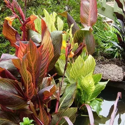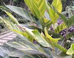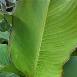 金脉美人蕉叶片淡黄色,叶脉绿化,叶缘具红边,全缘,大花美人蕉之变种