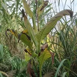 蕉芋:为美人蕉科的植物。多年生草本植物,高达3米。具块状根茎。茎紫色,直立,粗壮。叶互生;叶柄短;…