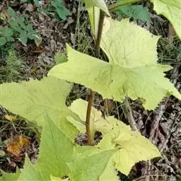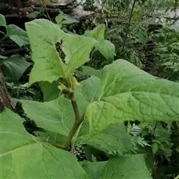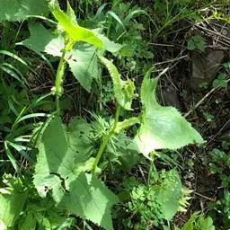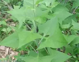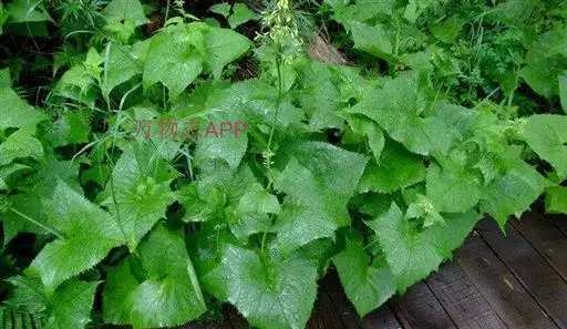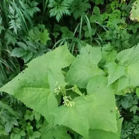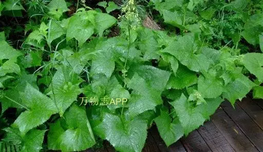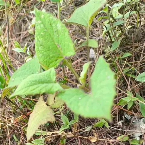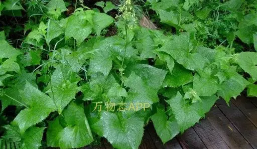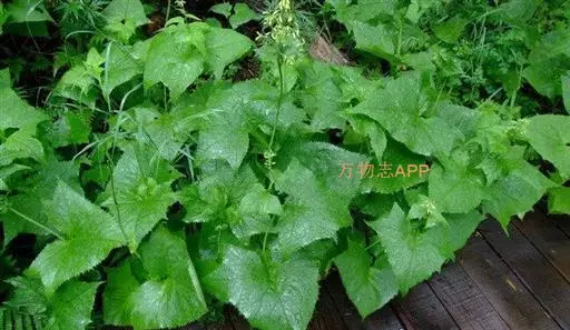 多年生草本,根状茎平卧,有多数较粗的须根。茎粗壮,直立,高(70)100-200厘米,下部直径8-12毫米,具纵条纹,无毛或被疏柔毛。下部叶在花期枯萎,中部叶叶片三角状戟形,稀扁三角状戟形,长20-30厘米,宽20-50厘米,顶端尾状急尖,基部截形或微心形,沿叶柄下延成宽翅,侧生裂片通常2裂,小裂片长披针形,顶端急尖,边缘微凹,具不规则的三角形或披针形的齿,薄质,离基3出脉,侧脉向上分叉,上面暗绿色,被疏短毛,下面淡绿色,沿脉被腺状短柔毛;叶柄短于叶片的2-3倍,具宽1.5-2厘米的翅,基部扩大而抱茎的大耳,上部叶渐小,具短叶柄,下部叶1-2,与中部茎叶同形,但较狭,三角状戟形,具2-3浅裂,或侧裂片边缘有较小的齿。