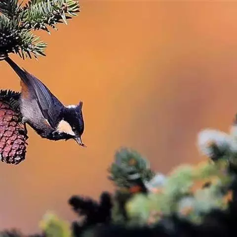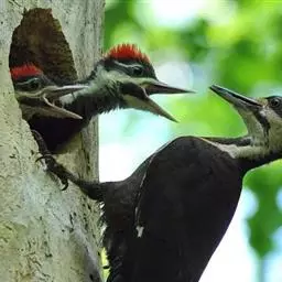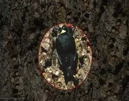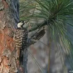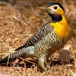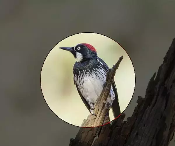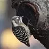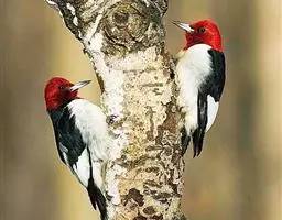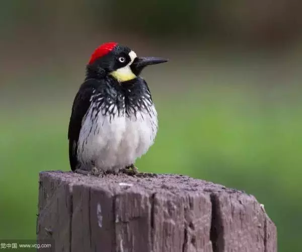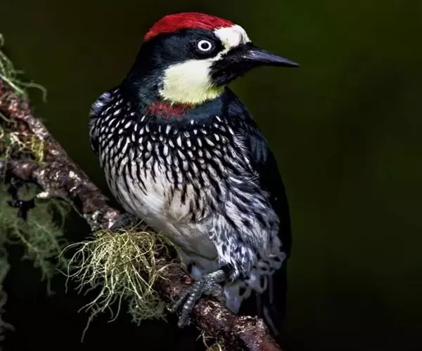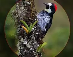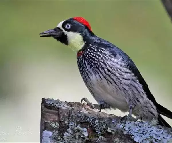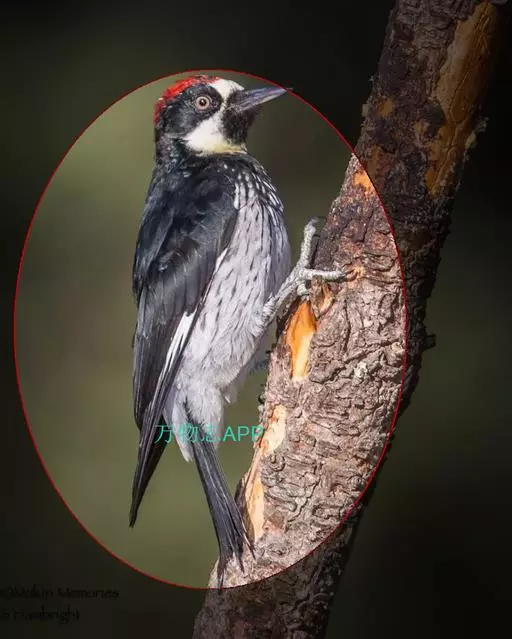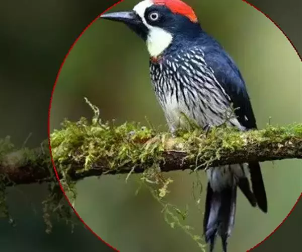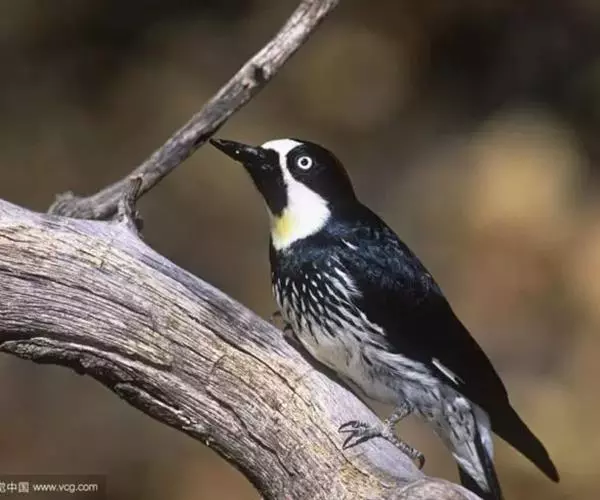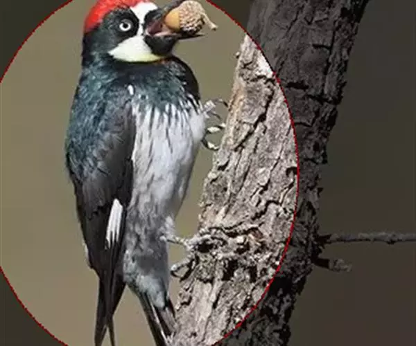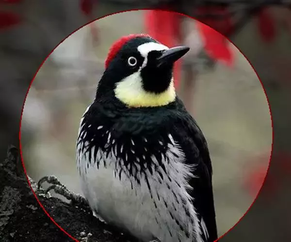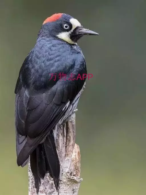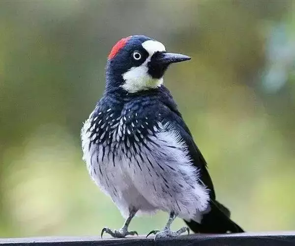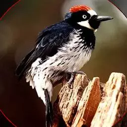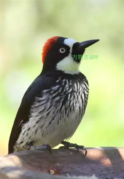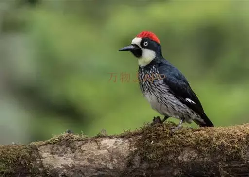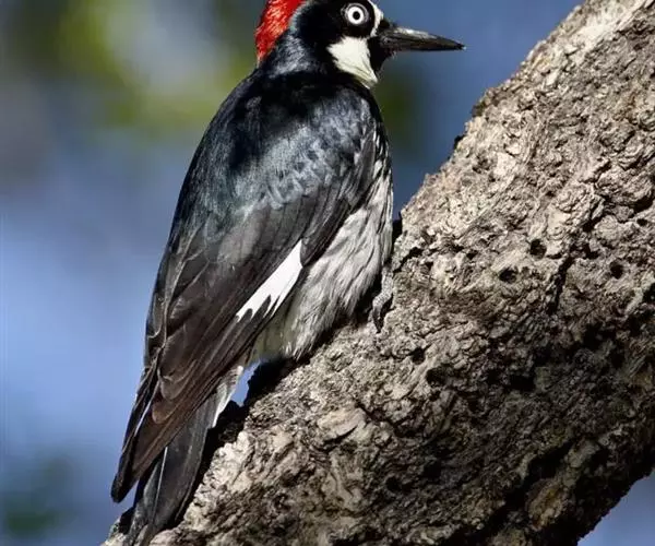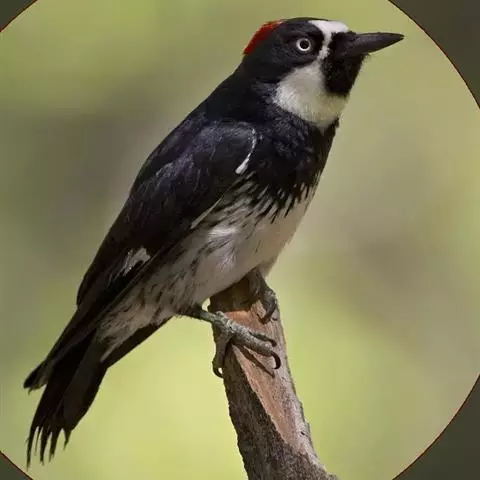 橡树啄木鸟(学名:Melanerpes formicivorus):体长20-23厘米。前额灰黄色,头顶、后颈红色。喉下部、腰和腹部白色,腹部有细的黑色纵条纹。其余体羽为黑色。嘴黑色。腿、脚暗灰色。