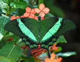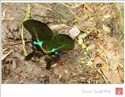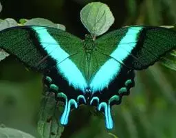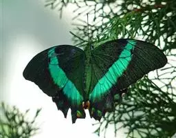 巴黎翠凤蝶中型凤蝶,躯体黑褐色,散布绿色亮鳞。后翅M3脉端有一明显叶状尾突。翅背面底色黑褐色,密布…